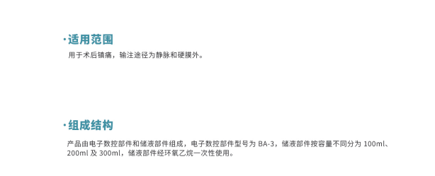 產品(pǐn)由電子數控部件和儲液部件組成,電子數控部件型號為 BA-3,儲液部件按容量不同分為 100ml、200ml 和 300ml,儲液部(bù)件經環氧乙烷滅菌一次性使用。